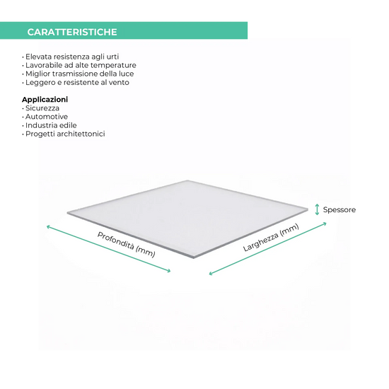 Estremamente resistente e trasparente, il policarbonato compatto da 2mm offre un'ottima protezione contro urti e intemperie, garantendo un'elevata durata e un'eccellente trasmissione luminosa. Resistente ai raggi ultravioletti (Protezione UV) che lo rende ideale per applicazioni esterne come coperture, serre, pensiline e vetrate.